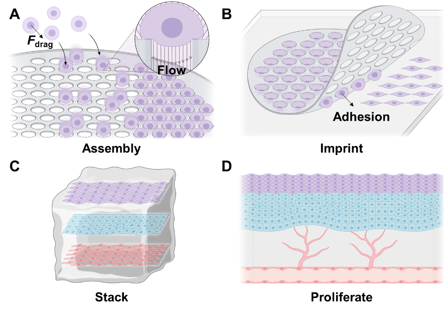 细胞组装作为构建细胞阵列、组织模型乃至类器官的关键环节,本质上是一种以细胞为基本单元的精密制造过程。当前,组织工程与药物筛选等领域对高效、高通量、高精度细胞组装技术需求迫切。行业内亟需一种能够平衡精度、效率与规模的全新方法。针对上述需求,清华大学汪家道课题组提出了一种流体驱动的细胞组装方法(Flow-Driven Cell Assembly, FDCA),巧妙融合微模板定位与流场调控的双重优势。该方法利用光刻技术制备微孔膜作...