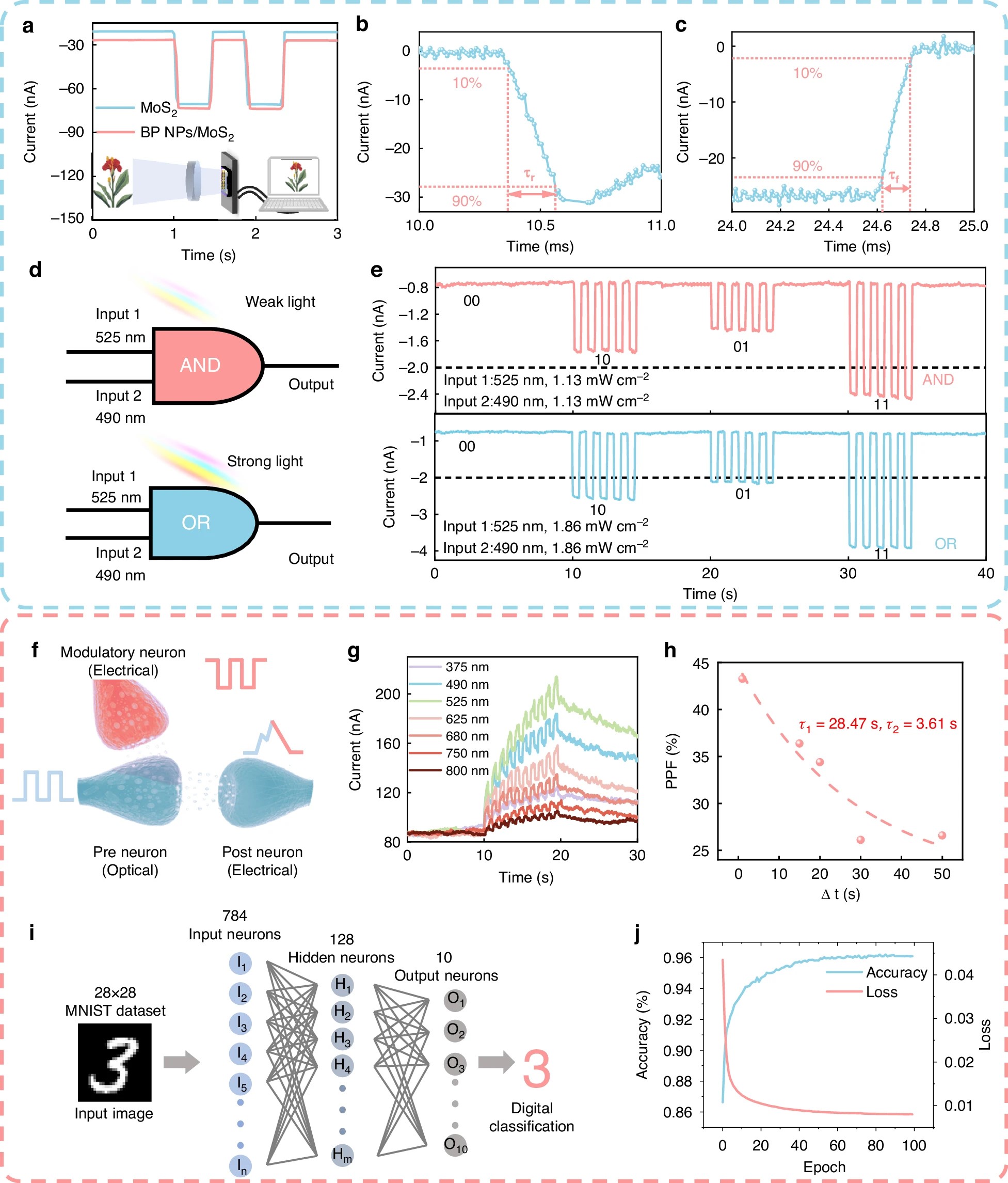 In terms of the device operating mechanism, this spatially asymmetric structure endows the device with markedly different optical responses under different bias directions. By reversing the direction of Vds, the device can switch reversibly between PD mode and NVS mode, thereby avoiding the integration burden associated with extra terminals or complex gating. The device can sense high-frequency optical signals up to 3030 Hz, with an optical energy consumption of only 191.2 pJ per event, and achieves a recognition accuracy of 96.20% in simulations of the MNIST handwritten digit recognition task.