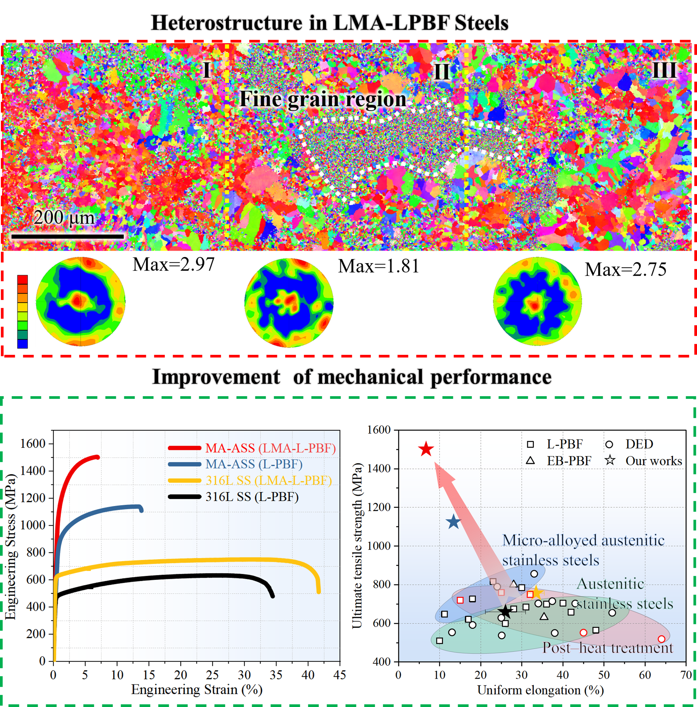 图3 液浮粉末床激光增材制造成形的异质结构不锈钢及其力学性能