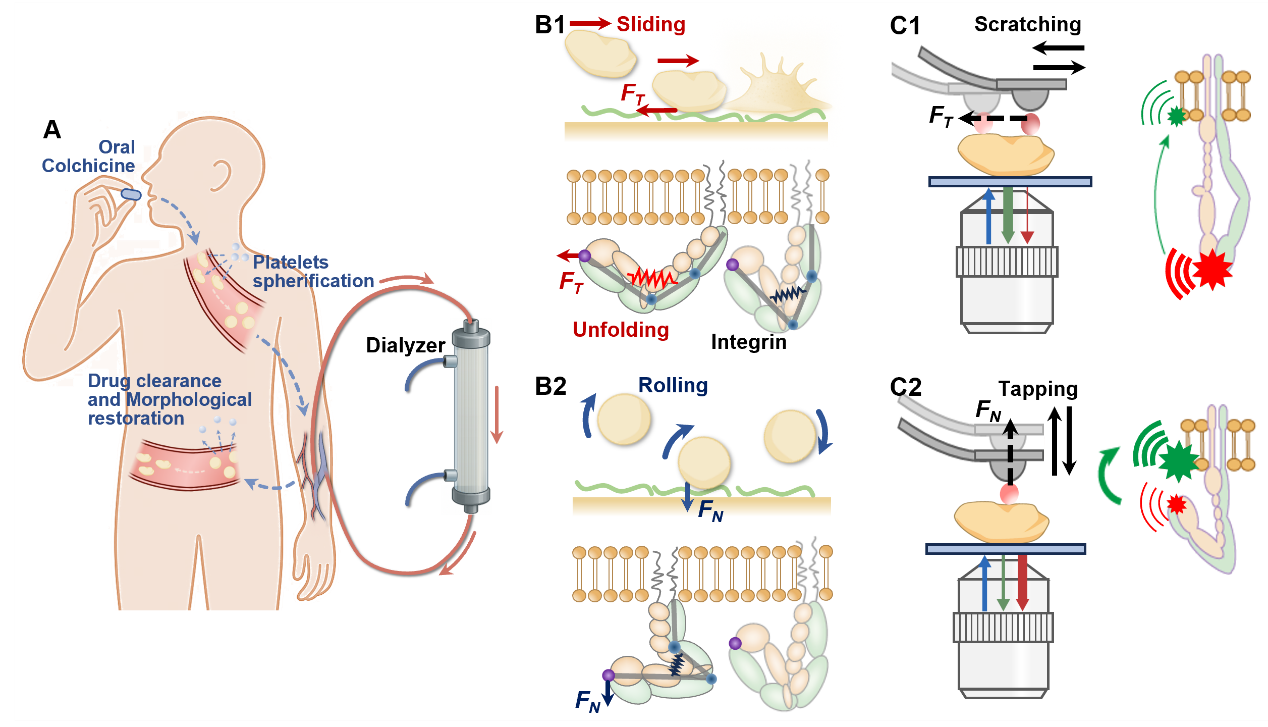 该研究利用研发的荧光原子力显微镜测量血小板表面摩擦力和相应的血小板激活状态。当血小板在表面滑动时,血流界面摩擦力会打开血小板表面的整合素αIIbβ3,从而触发凝血反应;而当血小板在表面滚动时,滚动摩擦只引起整合素头部的旋转,无法触发其构象的展开,从而抑制了血小板的激活。在体外血液透析实验中,通过调控血小板的滚滑运动有效地减少了凝血风险,如图所示。