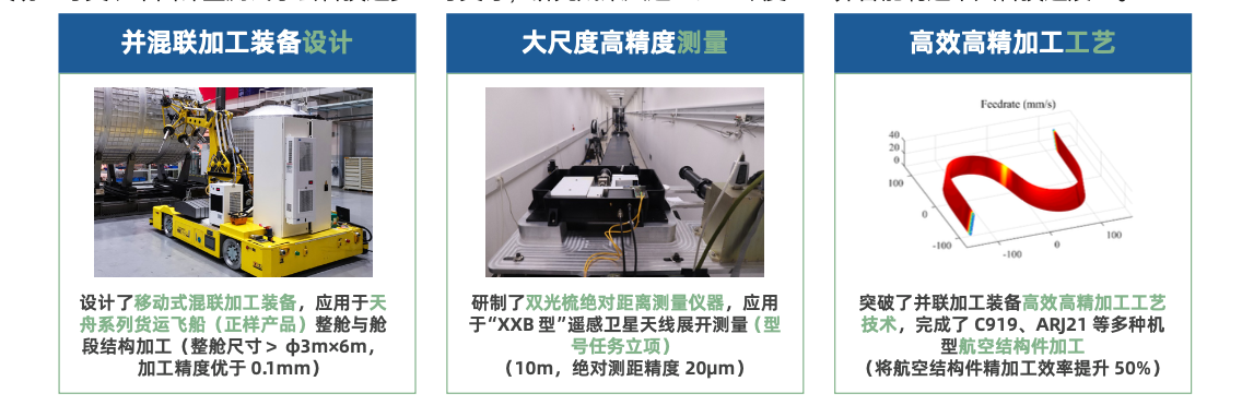 实验室团队在杰青项目、基金委集成和重大仪器项目、重点研发计划、北京市科技计划等项目支持下,长期从事变革性制造技术研究,在加工装备设计、大尺度高精度测量、高效高精加工工艺等方面取得了丰富的成果积累。设计了移动式混联加工装备,应用于天舟系列货运飞船(正样产品)整舱与舱段结构加工以及我国大型卫星的整体制造;研制了双光梳绝对距离测量仪器,应用于“XXB 型”遥感卫星天线展开测量;突破了并联加工装备高效高精加工工艺技术,完成了C919、ARJ21 等多种机型航空结构件加工。