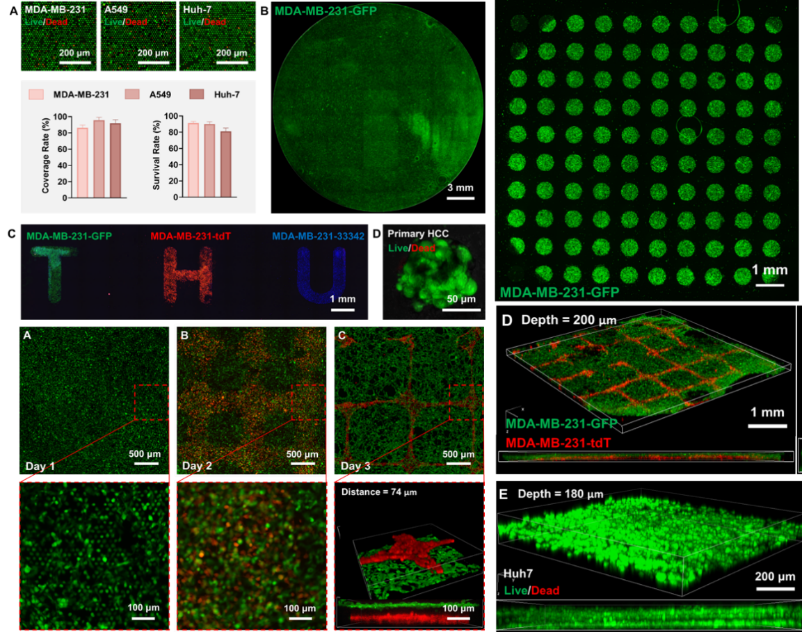该方法展现出诸多优势:支持多种细胞系与原代细胞的高效组装,组装面积可达3 cm⟡,细胞密度高达10⁷ cells/cm³,并可借助定制化光刻掩模实现层内与层间的复杂图案化,为制备大面积类器官阵列奠定基础。这一技术路径,为高通量药物筛选和组织工程应用提供了前所未有的批量化细胞组织制造手段。