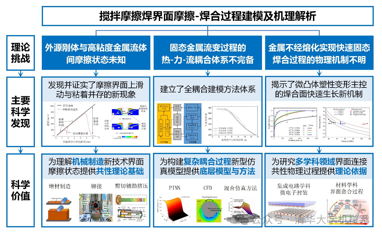 史清宇团队针对搅拌摩擦焊过程中经典理论难以解释的摩擦与焊合现象,提出了塑性变形主控的快速固态焊合机制,构建了焊合率演化微分方程,在国际上率先建立了粘着-滑动自适应的摩擦模型,建立了热-力-流全耦合建模体系,阐明了搅拌摩擦焊过程中界面摩擦-焊合的机理,支撑了多型航天、轨交装备的成功研制,相关理论成果产生了广泛的学术影响,获得多位国内外知名专家的好评,并被多本国内外教材和专著收录。