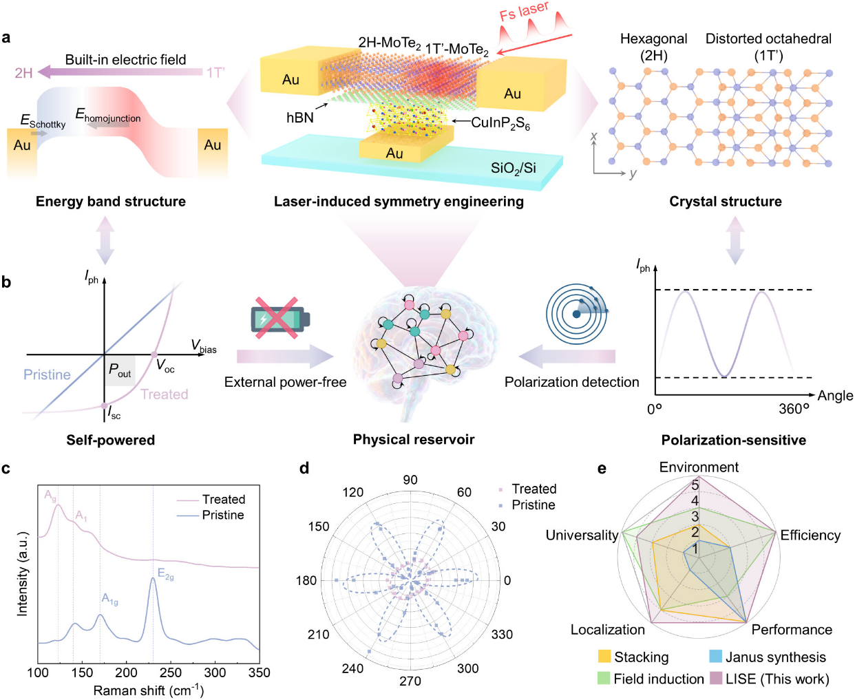 针对现有二维材料难以在单一器件中兼顾自驱动传感、偏振敏感性和神经形态计算的问题,近日,清华大学机械系邹贵生教授、刘磊副教授、霍金鹏助理研究员团队开发一种单步、简便的超快激光诱导对称性工程(Laser-induced symmetry engineering, LISE)工艺,在单一的MoTe2基架构中制备了自驱动、偏振敏感的类脑视觉器件。通过调控局部相变实现了能带结构和晶体结构的同步对称性工程。这种双重非对称性使得器件能够通过自供能运行,并具备固有的偏振敏感探测能力。此外,通过集成二维铁电材料 CuInP2S6(CIPS)构建铁电场效应晶体管(FeFET),具备易失性光忆阻能力,并实现了基于物理储备池计算的类脑视觉功能。该器件能够实现全光驱动计算,其计算能力可由光偏振态主动调制,并由栅极电压进行预调控。