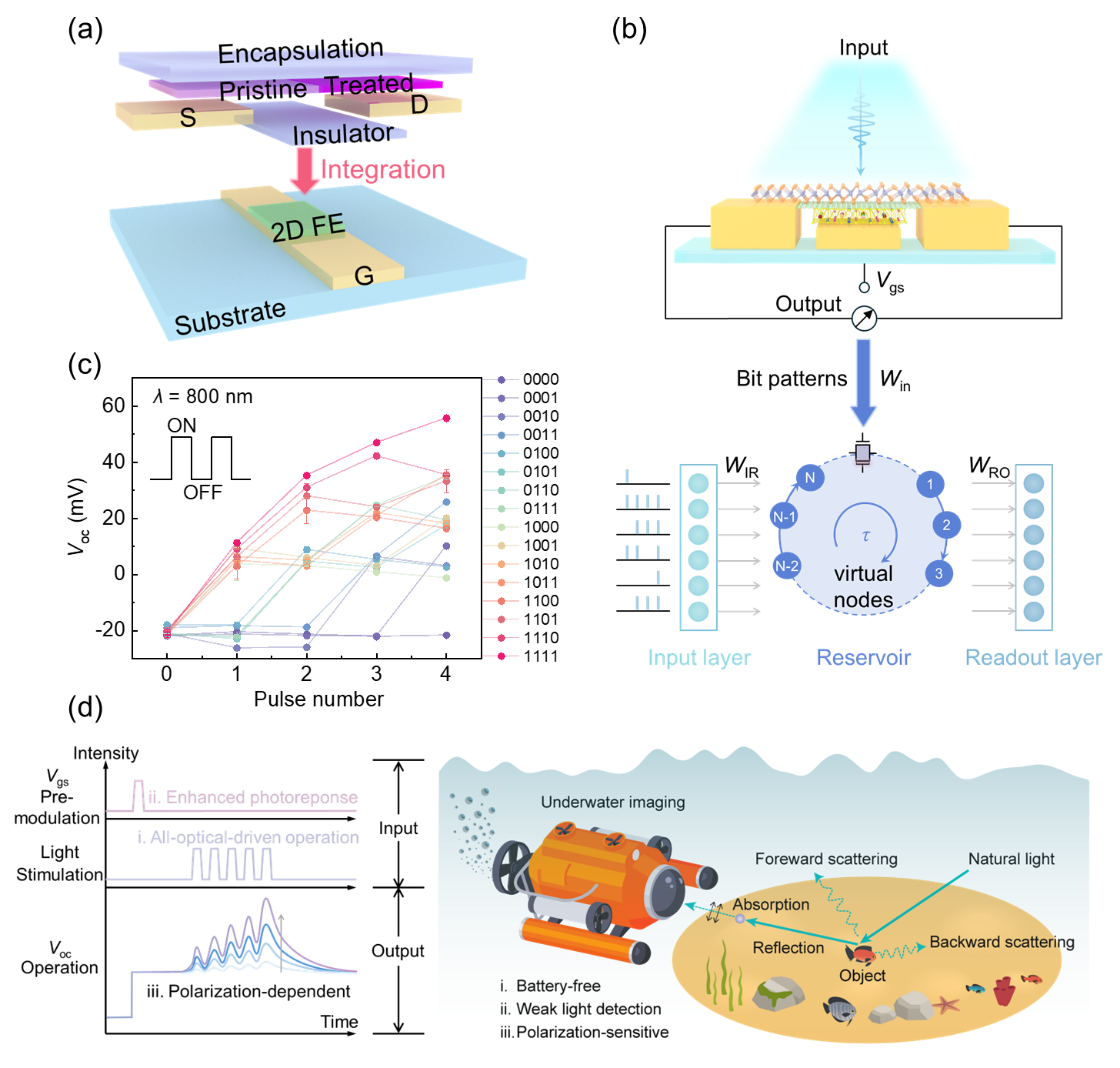 进一步集成了二维铁电材料CIPS作为栅极介质,构建了具有非易失性存储功能的FeFET器件。利用CIPS的铁电极化场对沟道载流子浓度的调制作用,结合器件的非线性瞬态动力学特性,成功构建了物理储备池计算系统。该系统在零外部供电模式下,仅依靠光脉冲能量即可进行计算,并在模拟水下成像任务中,通过检测光的偏振状态有效滤除散射噪声,显著提升了图像识别的准确率和清晰度,实现了“感-存-算”一体化的低功耗智能视觉感知。
