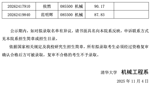 清华大学2026年机械工程系接收推荐免试直硕生拟录取名单公示