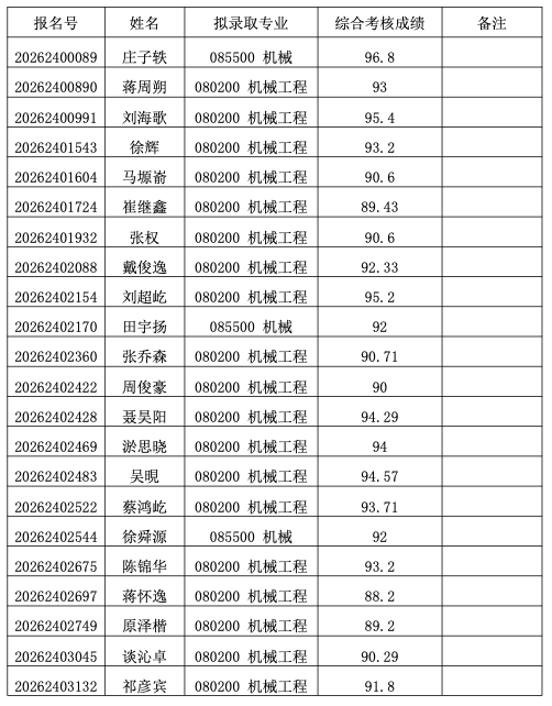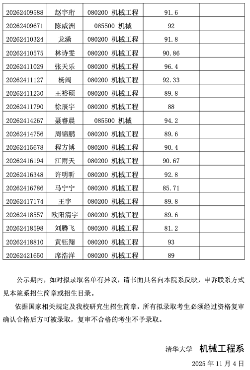 清华大学2026年机械工程系接收推荐免试直博生拟录取名单公示